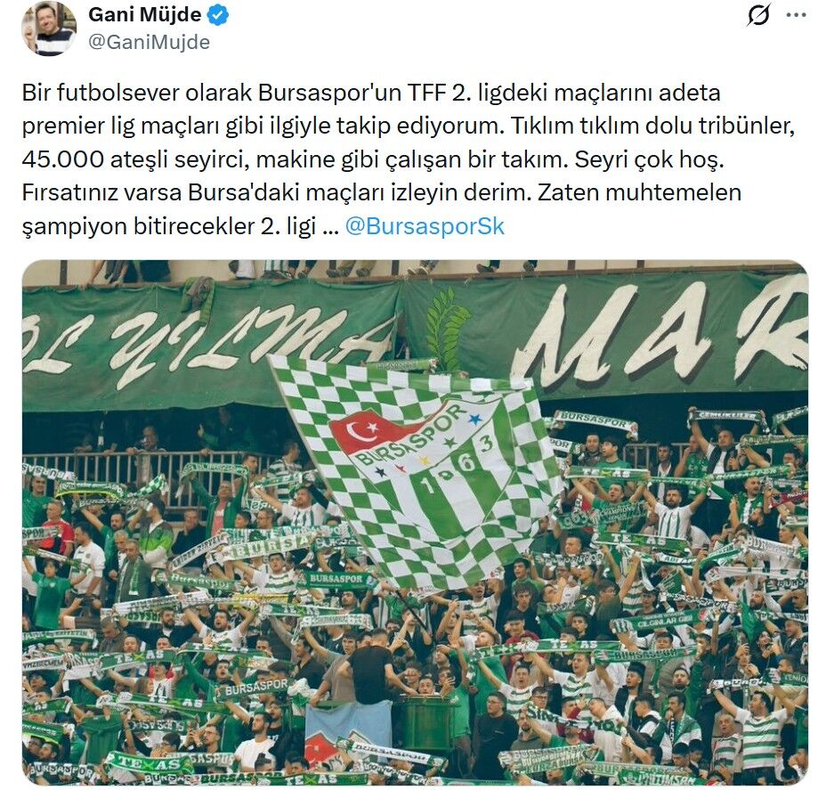 Gani Müjde, özellikle dolu tribünler ve takımın sahadaki uyumuna dikkat çekerken, ortaya konan futbolun izlenebilirliğinin yüksek olduğunu ifade etti. Bursaspor’un sezon sonunda şampiyonluğa ulaşacağı yönündeki görüşünü de paylaşan Müjde, Bursa’daki maçların futbolseverler için özel bir deneyim sunduğunu belirtti.